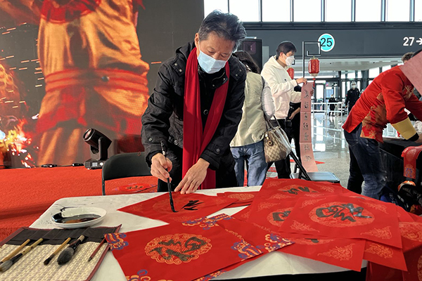 春節將至,1月11日,杭州機場開展“辭舊迎新 大展宏‘兔’”新春文化活動,邀請書法名家現場揮毫潑墨,為旅客寫春聯、送福字,營造濃厚過節氣氛,送上新春美好祝福。