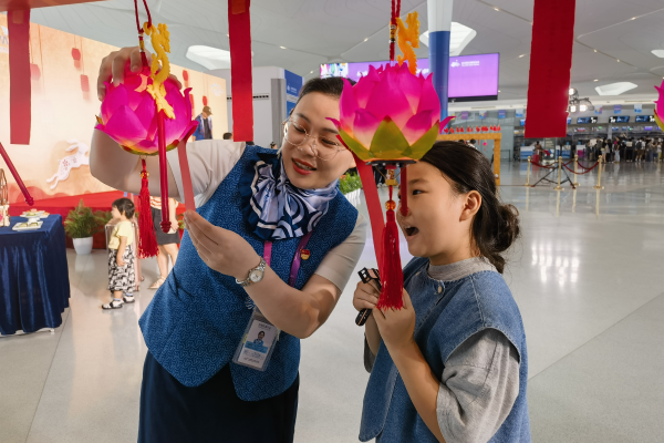 一組悠揚(yáng)的民樂組曲拉開活動序幕,旅客紛紛向舞臺中央聚攏。航站區(qū)中心活動主持人上臺向旅客介紹杭州機(jī)場服務(wù)品牌“杭行無憂”的誕生記,以及此次活動內(nèi)容。與以往節(jié)慶文化活動不同,此次活動增添員工風(fēng)采展示部分,航站區(qū)中心員工、空港百靈和黨員初心站社會志愿者分別向旅客演唱歌曲和詩歌朗誦,一首男女合唱的《私奔到月球》更是引起旅客歡呼。活動現(xiàn)場,兩位身著漢服的工作人員以“對答詩詞”的形式帶領(lǐng)旅客體會古時文人墨士對中秋佳節(jié)的歌頌,貴賓公司工作人員則邀請旅客進(jìn)行“猜燈謎”,品嘗親制烘焙的月餅。