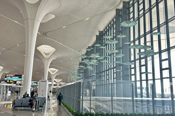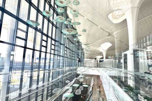 與傳統大型空間藝術展陳裝置不同的是,“煙雨江南”裝置不僅彰顯了地域文化風采,同時還具備空防安全的效用。自T4投運以來,25號門兩側、T4國內行李提取通道上空,因空間屬性特殊,存在一定的安全隱患。在民航浙江監管局空防處多次現場調研和寶貴建議下,航站區中心立足區域管理中心職責,主動作為、立題設項,組織多場內部研討,提出了建造兼具安全、美觀功能性裝置的破題思路,在管控空防安全隱患、減少安保人員配置的同時,持續賦能T4文化屬性。