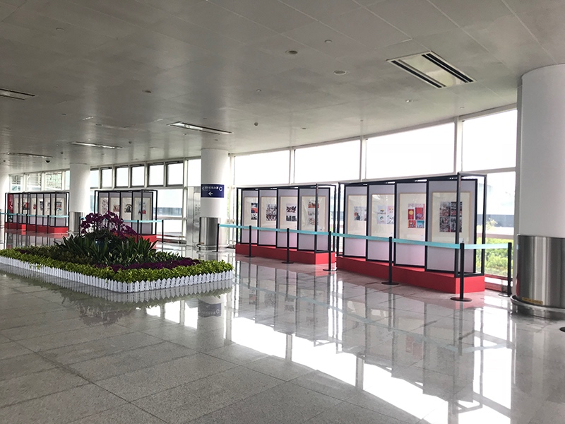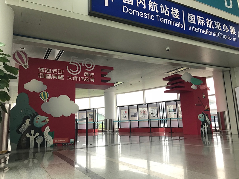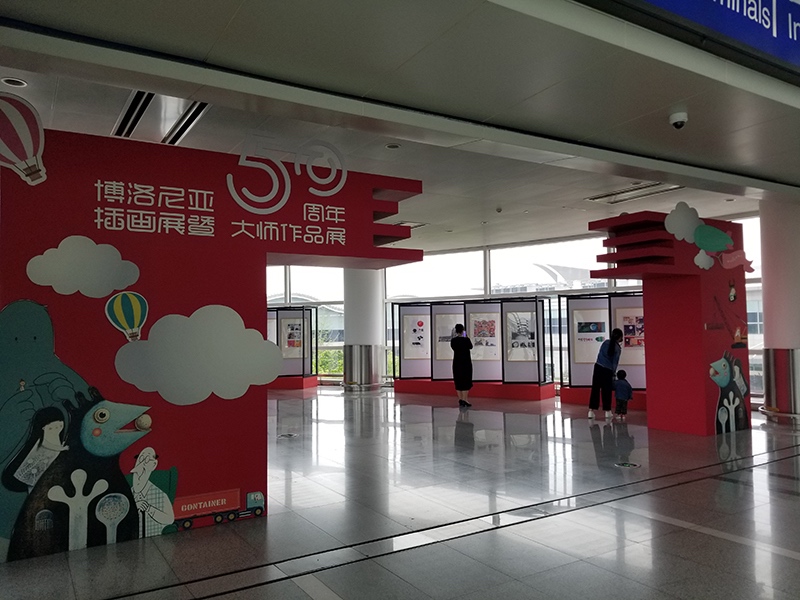 為營造濃郁的機場文化藝術氛圍,著力打造人文機場、品質機場,航站區中心利用T1、T2連廊打造文化藝術長廊,4月11日,航站區中心在連廊處舉辦“意大利博洛尼亞插畫展”,共有70幅著名插畫師的插畫作品進行展出,同時在長廊T2端搭建造型美觀的展覽門頭,進一步營造航站樓文化藝術氛圍。