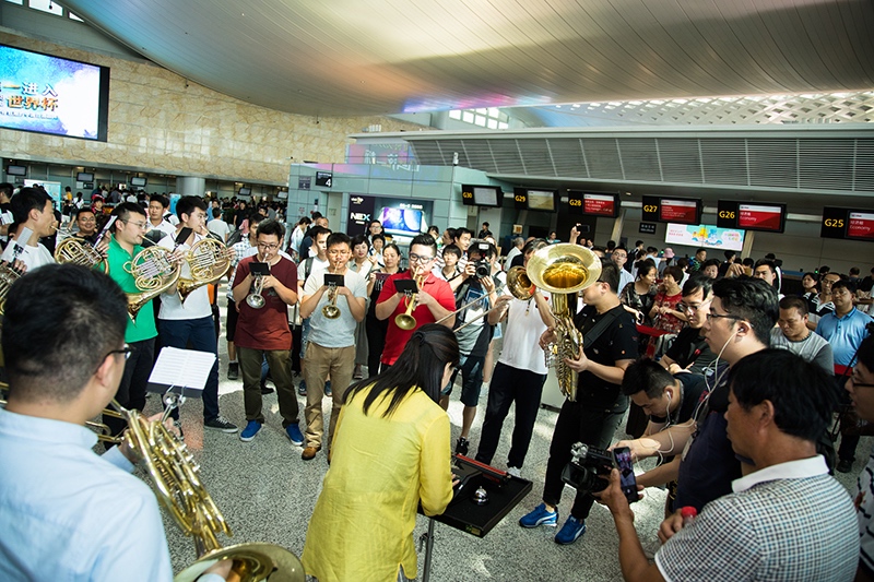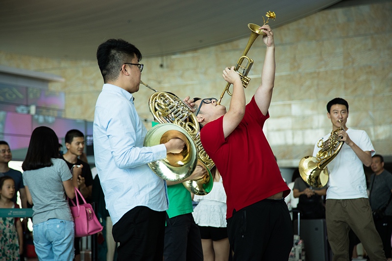 2018年7月13日,由航站區管理中心聯合杭州愛樂樂團共同舉辦的“交響樂快閃”文化活動在T3航站樓出發大廳傾情上演。下午14點,一聲清脆的小號聲拉開了活動的序幕,在人流如織的航站樓內,年輕的樂手們為旅客帶來了一場前所未有的視聽享受——小號、圓號、長號、大管、雙簧管等樂器一應俱全,樂手們用自己嫻熟的技巧演奏了的《茉莉花》、《失戀陣線聯盟》、《打字機》等經典名曲,成功引來過往旅客的駐足觀看,旅客們紛紛拿出手機拍照留戀。不少人更是陸續加入的表演活動中,令“交響樂快閃”活動現場變得人山人海、熱鬧非凡。(航站區中心 王源斌 朱偉)