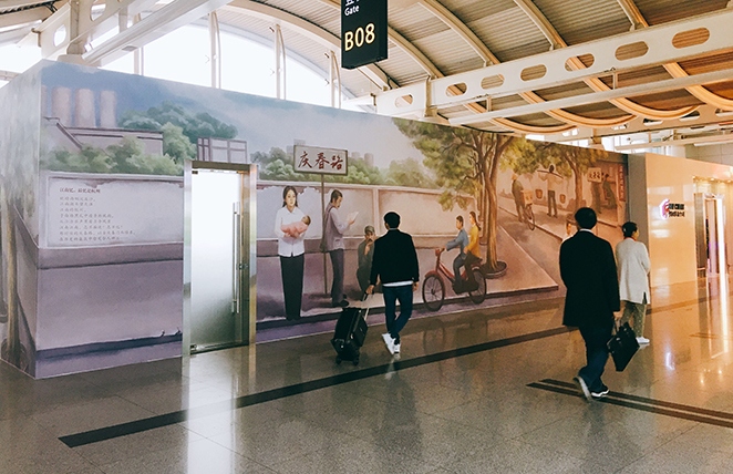 首個主題墻繪亮相候機樓,位于T1隔離區國航貴賓廳旁,主題為“杭州記憶”,取材70年代的“慶春老路”“煙雨西湖”等景色,運用墻繪、懷舊、西湖、老街等元素,采用油彩工藝,以復古、朦朧的質感,實現藝術與情懷的碰撞,將煙雨迷蒙的西湖美景和70年代杭州市井風貌生動呈現給旅客。此文化墻是航站區中心在候機隔離區出發層開辟的首個墻面文化展示區,為航站樓文化宣傳陣地增添了新的亮點。