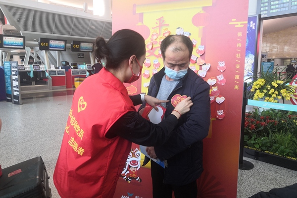 為確保本場春運工作平穩有序開展,航站區中心聯合飛行區中心、安護部、地勤公司、防疫辦、省空港貴賓公司等部門以及機場公安、國航、南航、長龍航空等單位組織開展“平安春運 防疫有我”主題活動?,F場向旅客征集“防疫志愿者”,共同做好樓內“規范佩戴口罩,保持安全防疫距離”提醒勸導活動。參與活動的防疫志愿者在留言板上留下防疫宣言和對祖國、親朋好友的新年祝福,為旅客留下獨特的春運記憶。